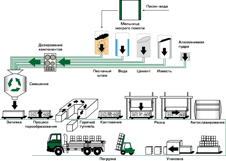 Эти компоненты смешиваются и поступают в автоклав, где в специальных условиях происходит их вспенивание и твердение.