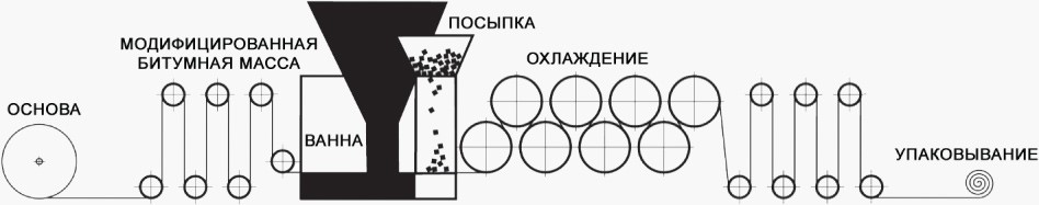 Еврорубероид производят, опуская основу (стеклохолст или полиэфирную) в битумную ванну. После выхода из ванной, снизу материала наносится тонкая пленка, которая не дает слипаться слоям рулона между собою, а сверху на еще горячий битум наносится крупнозернистая каменная посыпка или песок, в зависимости от марки материала. Смотрите ниже.